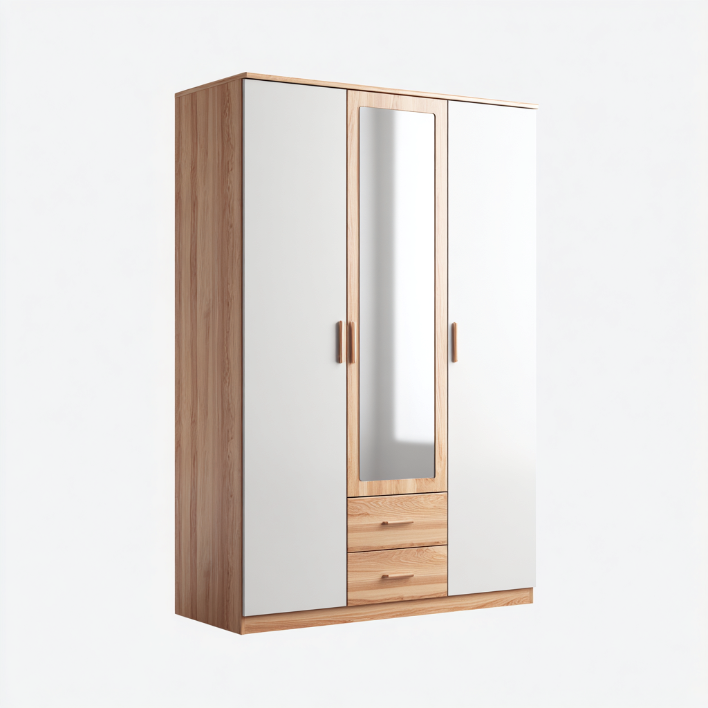 Struttura realizzata in legno con finitura legno naturale. Ante con pannelli bianchi e inserto centrale in vetro a specchio. Le superfici sono rifinite con cura per garantire stabilità e una buona durata nell'uso quotidiano.